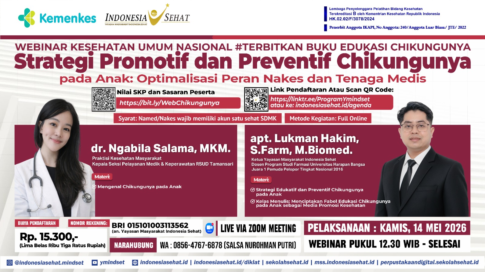 Read MoreWebinar Kesehatan Umum Nasional Strategi Promotif dan Preventif Chikungunya pada Anak: Optimalisasi Peran Nakes dan Tenaga Medis Untuk memudahkan pendaftaran, silahkan klik tombol berikut: Chikungunya merupakan penyakit infeksi virus yang ditularkan melalui gigitan nyamuk Aedes, terutama Aedes aegypti dan Aedes albopictus, yang masih banyak ditemukan di wilayah tropis dan subtropis. Mobilitas penduduk, perubahan iklim, kepadatan hunian,…