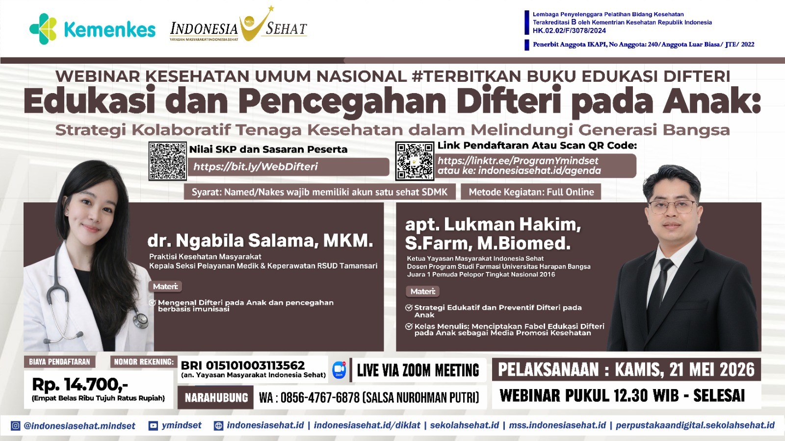 Read MoreWebinar Kesehatan Umum Nasional Edukasi dan Pencegahan Difteri pada Anak: Strategi Kolaboratif Tenaga Kesehatan dalam Melindungi Generasi Bangsa Untuk memudahkan pendaftaran, silahkan klik tombol berikut: Difteri merupakan penyakit infeksi akut yang disebabkan oleh bakteri Corynebacterium diphtheriae yang dapat menyerang saluran pernapasan dan menghasilkan toksin berbahaya bagi tubuh. Penyakit ini masih menjadi masalah kesehatan masyarakat karena berpotensi…