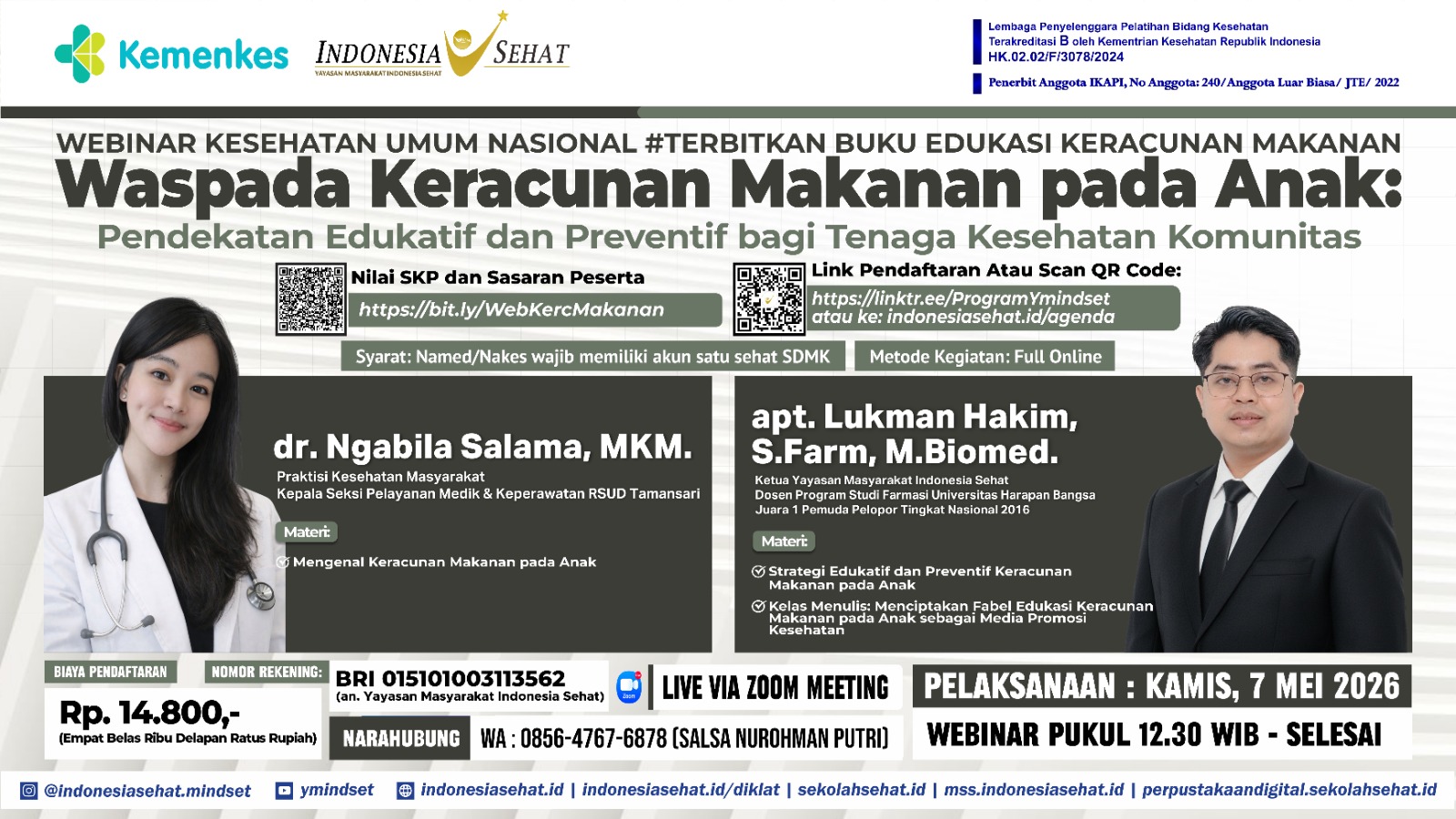 Read MoreWebinar Kesehatan Umum Nasional Waspada Keracunan Makanan pada Anak: Pendekatan Edukatif dan Preventif bagi Tenaga Kesehatan Komunitas Untuk memudahkan pendaftaran, silahkan klik tombol berikut: Keracunan makanan pada anak masih menjadi salah satu masalah kesehatan masyarakat yang sering terjadi di Indonesia, terutama pada usia balita dan anak sekolah. Kondisi ini tidak hanya menimbulkan gangguan kesehatan akut seperti…