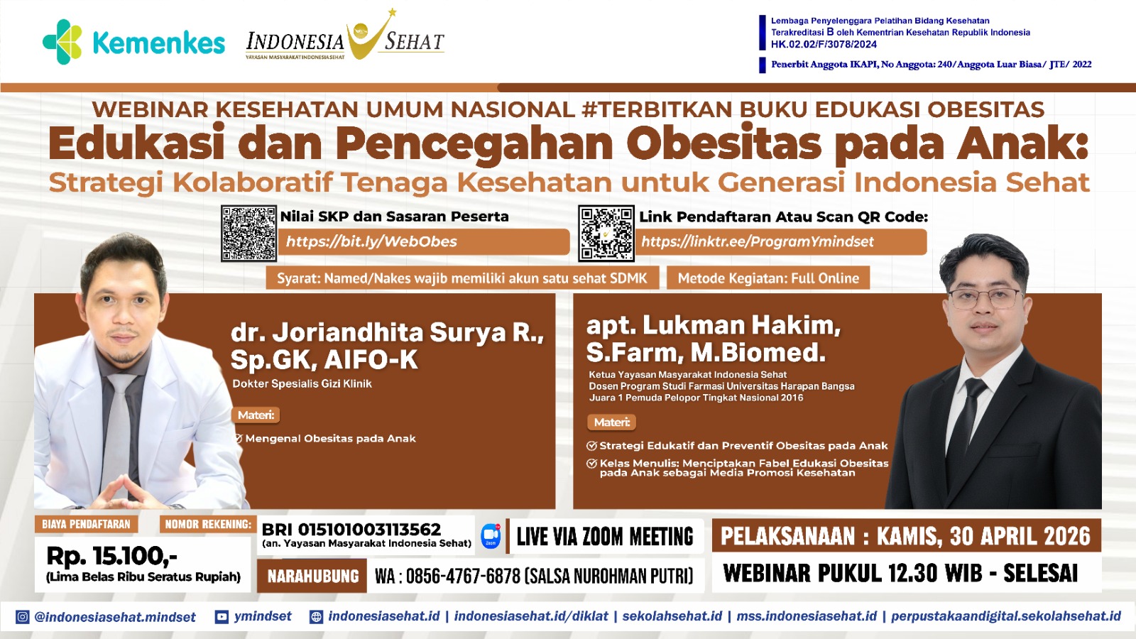 Read MoreWebinar Kesehatan Umum Nasional Edukasi dan Pencegahan Obesitas pada Anak: Strategi Kolaboratif Tenaga Kesehatan untuk Generasi Indonesia Sehat Untuk memudahkan pendaftaran, silahkan klik tombol berikut: Obesitas pada anak merupakan salah satu masalah kesehatan masyarakat yang semakin meningkat di Indonesia. Data menunjukkan bahwa prevalensi anak dengan kelebihan berat badan dan obesitas terus bertambah, yang berisiko menimbulkan…