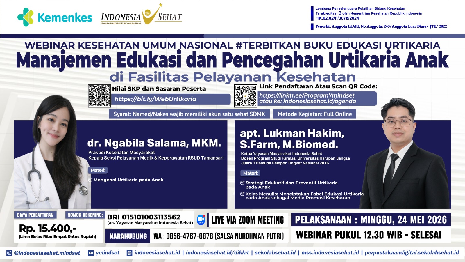 Read MoreWebinar Kesehatan Umum Nasional Manajemen Edukasi dan Pencegahan Urtikaria Anak di Fasilitas Pelayanan Kesehatan Untuk memudahkan pendaftaran, silahkan klik tombol berikut: Urtikaria merupakan salah satu gangguan kulit yang sering dijumpai pada anak dan dapat menimbulkan ketidaknyamanan yang signifikan, seperti rasa gatal hebat, gangguan tidur, dan penurunan kualitas hidup anak. Meskipun sebagian besar kasus bersifat akut dan…