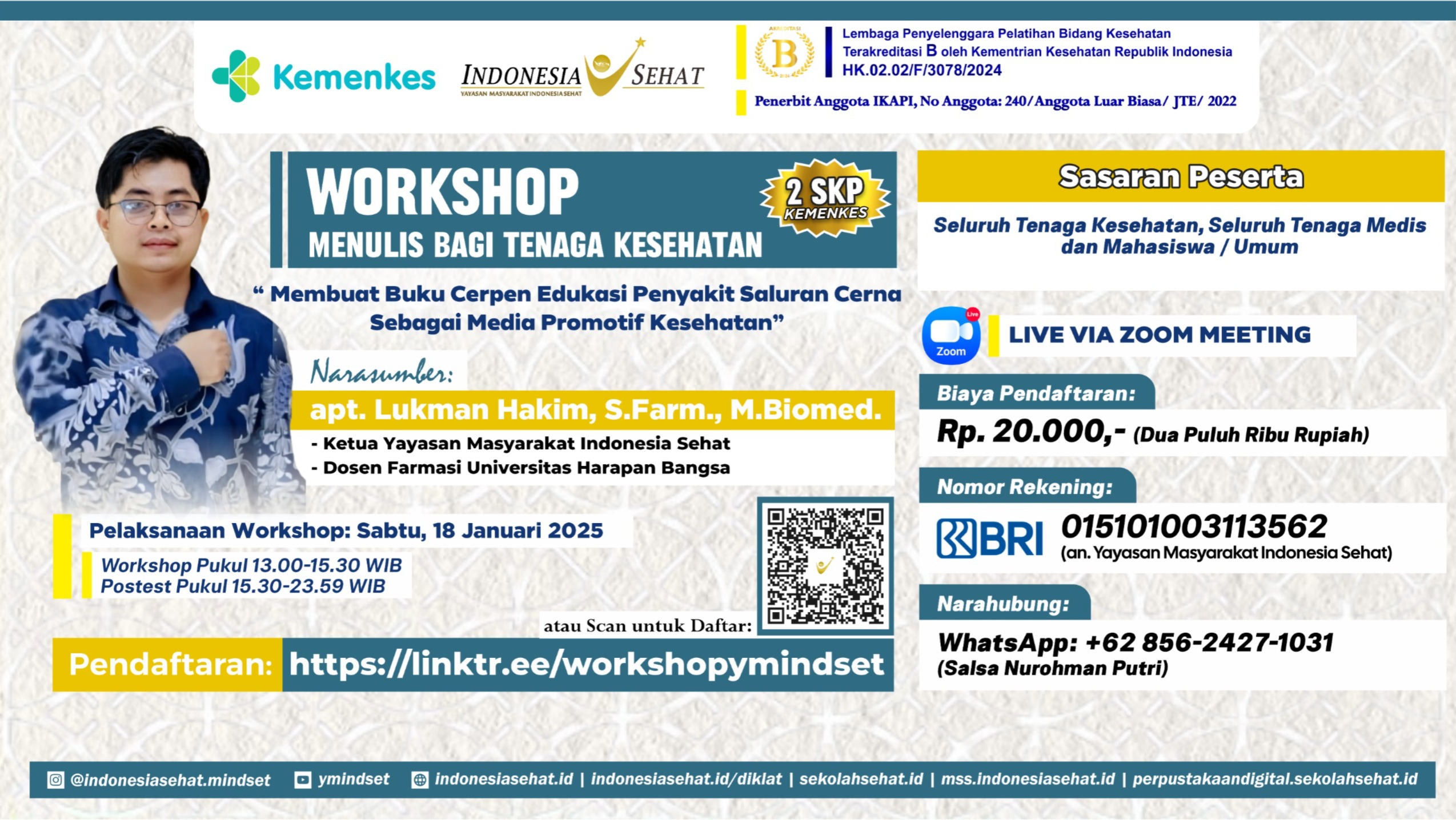 Read MoreWorkshop Menulis bagi Tenaga Kesehatan: Mengemas Media Promotif Kesehatan Anak-Anak dalam Cerita Fabel 2 SKP Kemenkes Narasumber:apt. Lukman Hakim, S.Farm., M.Biomed.(Ketua Yayasan Masyarakat Indonesia Sehat) Pelaksanaan: Rabu, 4 Desember 2024Workshop Pukul 13.00-16.00 WIBPostest Pukul 16.00-23.59 WIB Sasaran PesertaSeluruh Tenaga Kesehatan, Tenaga Medis dan Non Tenaga Kesehatan (Mahasiswa) Via Zoom Meeting dan Youtube Biaya Pendaftaran: Rp.…